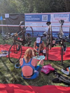 Pünktlich startete das Schwimmen im kühlen Bergwitzsee, aller 10 sec etwa 5 Athleten, sodass man die ca. 700m ohne die üblichen Positionskämpfe am Anfang bestreiten konnte. Bei beiden LFV‘lern lief es gut, ich kam nach 11‘ aus dem Wasser, Jessica ca 30sec früher.